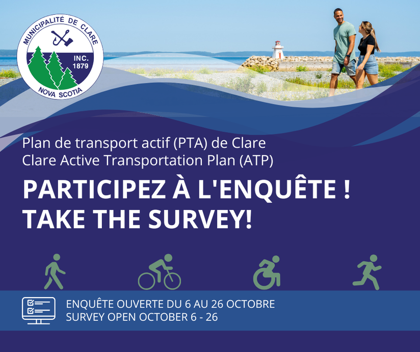 La Municipalité de Clare élabore actuellement un plan de transport actif (PTA). Ce plan développera le réseau actuel et améliorera la connectivité dans l'ensemble de notre communauté.